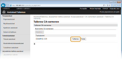 Valitse [Tallenna] tallennettavan CA-varmenteen oikealla puolella.