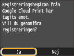 Du kan även registrera enheten från en mobil enhet eller Google Chrome. Enhetens skärm visar följande bekräftelseskärm innan registreringen slutförs. Tryck på <Ja> för att avsluta registreringen.