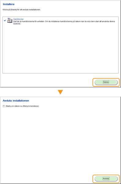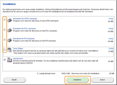 Avmarkera alla kryssrutor utom [Manuals] (Handböcker) och klicka på [Install] (Installera).