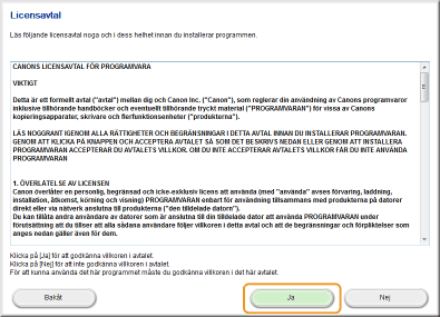Läs licensavtalet och godkänn det genom att klicka på [Yes] (Ja).