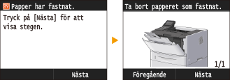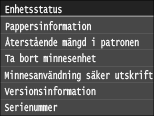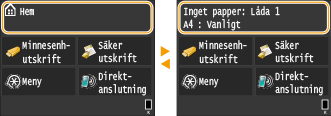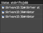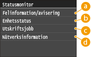 visas en skärm som du använder för att kontrollera status för dokument som skrivs ut, men även enhetens status (återstående toner i tonerpatronen osv.) eller information om nätverksinställningar som t.ex. enhetens IP-adress.
