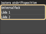 Använd <Skrivarinställningar> på kontrollpanelens inställningsmeny om du vill justera utskriftspositionen för alla utskriftsjobb, oavsett papperskälla. Du kan justera utskriftspositionen i intervallet -50,0 till +50,0 mm i steg om 0,5 mm i vertikal/horisontell riktning.