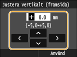 Justera utskriftspositionen om ett dokument skrivs ut ocentrerat eller utanför utskriftsområdet. Du kan justera utskriftsposititionen för respektive utskriftskälla. Du kan justera utskriftspositionen inom intervallet -5,0 till +5,0 mm i vertikal led och intervallet -3,0 till +3,0 mm i horisontell led, båda i steg om 0,1 mm.
