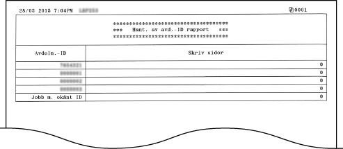 När hantering av avdelnings-ID är aktiverad kan du kontrollera den totala volymen utskrifter för varje <Avdelnings-ID> genom att skriva ut en rapport för hantering av avdelnings-ID. Genom att kontrollera utskriftsantalet kan du bättre hantera din pappers- och tonerförbrukning.