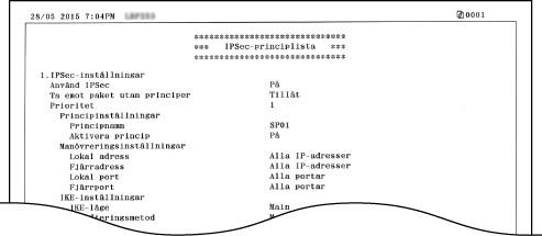 Du kan kontrollera listan med principnamn och de IPSec-inställningar som registrerats i enheten genom att skriva ut en IPSec-principlista.