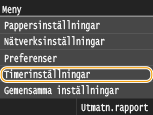 Alla inställningar för timern visas med korta beskrivningar. Standardinställningarna markeras med ett kors (