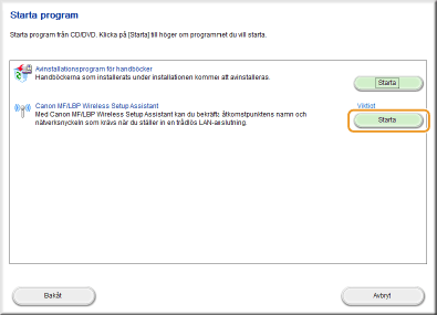 Klicka på [Start] (Start) för [Canon MF/LBP Wireless Setup Assistant] (Canon MF/LBP-assistenten för inställning av trådlöst nätverk).