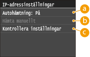 ![]() Om <På> visas trycker du på <Autohämtning> och ställer in både <Välj protokoll> och <Auto-IP> på <Av>.