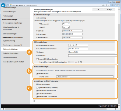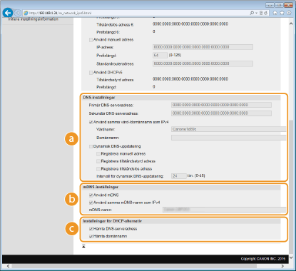 Markera kryssrutan för att dynamiskt uppdatera DNS-posterna när enhetens IP-adress ändras. Om du anger ett intervall mellan uppdateringar anger du tiden i timmar i textrutan [Intervall för dynamisk DNS-uppdatering]. [mDNS-inställningar][Använd mDNS]