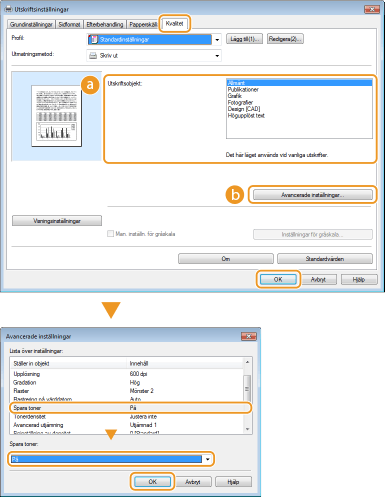 Välj [Spara toner] [Avancerade inställningar] på skärmen
