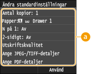 Välj det alternativ du vill ställa in och ändra standardvärdet.