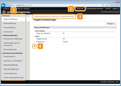 Visar sidan [Inställningar/Registrering]. När du har loggat in i systemhanteringsläge kan du ändra inställningarna och spara/läsa in registrerade data.