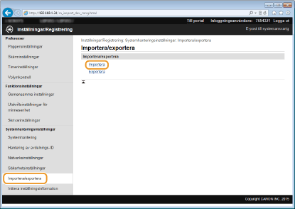 Läs in (importera) data som exporterats från enheten. Du kan även importera inställningar från en annan enhet om det är samma modell som din enhet.