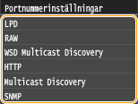 Portar fungerar som slutpunkter vid kommunikation med andra enheter. Vanliga portnummer används för de flesta protokoll, men enheter som använder dessa portnummer blir sårbara för angrepp eftersom dessa portnummer är välkända. Din nätverksadministratör kan ändra portnumren för att öka säkerheten. När ett portnummer har ändrats måste det nya numret delas med kommunikationsenheterna, till exempel datorer och servrar. Ange portnummerinställningar beroende på nätverksmiljön.