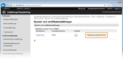 Klicka på [Registrera standardnyckel] till höger om ett nyckelpar som du vill använda.