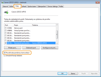 Na kartě [Porty] se ujistěte, že je zaškrtnuto políčko [Umožnit obousměrnou komunikaci].