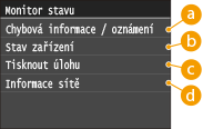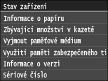 Zobrazí stav zařízení, např. množství papíru nebo zbývající množství toneru v kazetě.