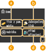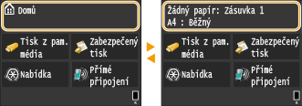 Na displeji se otevře obrazovka <Domů> nebo obrazovka nastavení, kde můžete spustit funkce, jako je tisk ze zařízení USB nebo zabezpečený tisk. Tento displej lze použít také ke kontrole různých informací, jako jsou chybové zprávy a provozní stav zařízení. Obrazovka je také dotyková, takže můžete provádět různé úlohy přímým stisknutím požadovaného místa na obrazovce.