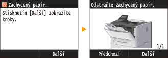 V některých případech se po výskytu chyby zobrazí postup, jak na chybu reagovat. Podle pokynů na obrazovce problém vyřešte. Jako příklad je níže uvedena obrazovka, která se objeví, když se zachytí papír.