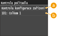 ), otevře se obrazovka <Kontrola počitadla>. Na této obrazovce si můžete prohlédnout hodnoty počitadel výtisků, sériové číslo a konfiguraci zařízení.
