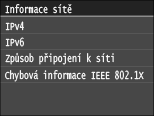 Zobrazuje síťová nastavení, jako je IP adresa zařízení, a stav, například komunikace v bezdrátové síti LAN.