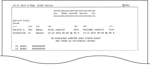 <Nabídka> <Výstup hlášení> <Tisknout seznam> <Hlášení protokolu kazety> Zkontrolujte, zda se údaje o velikosti a typu papíru na obrazovce shodují s papírem vloženým v zařízení <OK> <Ano>