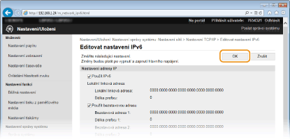 Kontrola správnosti nastaveníZkontrolujte, zda lze pomocí počítače zobrazit Vzdálené uživatelské rozhraní tak, že zadáte adresu IPv6 zařízení. Spuštění Vzdáleného uživatelského rozhraní