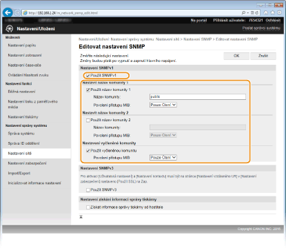 SNMP (Simple Network Management Protocol) je protokol určený k monitorování a ovládání komunikačních zařízení v síti pomocí funkce MIB (Management Information Base). Zařízení podporuje protokol SNMPv1 a protokol SNMPv3 s vylepšenými funkcemi zabezpečení. Stav zařízení lze zkontrolovat z počítače při tisku dokumentů nebo pomocí Vzdáleného uživatelského rozhraní. Můžete povolit buď protokol SNMPv1, nebo SNMPv3, případně oba současně. U každé verze zadejte nastavení odpovídající síťovému prostředí a účelům používání.