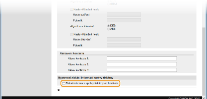 Vyhrazená komunita představuje předvolenou komunitu, určenou výhradně pro správce používající software Canon (např. iW Management Console). Políčko zaškrtněte, chcete-li používat vyhrazenou komunitu. Pokud funkci vyhrazené komunity nechcete používat, zaškrtnutí políčka zrušte.