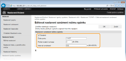 Políčko zaškrtněte, pokud chcete software pro správu zařízení upozorňovat na stav napájení zařízení. Je-li zaškrtnuto políčko [Oznámit], nebude docházet ke zbytečné komunikaci zařízení během režimu spánku a sníží se celková spotřeba energie. [Číslo portu]