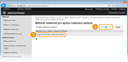 Použití doplňků aplikace iW Management ConsoleMusíte povolit nastavení vyhrazeného portu a protokolu SNMP. Při nastavování SNMP nastavte [Povolení přístupu MIB] na [Čtení/Zápis] pro oba doplňky SNMPv3 i SNMPv1. Nastavení vyčleněného portu Monitorování a ovládání zařízení pomocí protokolu SNMP