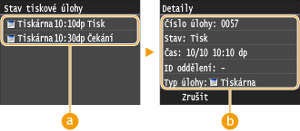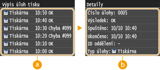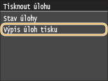 ![]() <Výpis úloh tisku>Zobrazí seznam vytištěných dokumentů. <Pokud byl dokument vytištěn úspěšně, zobrazí se zpráva <OK>, pokud se dokument nepodařilo vytisknout, protože byl zrušen nebo došlo k chybě, zobrazí se zpráva <Chyba>.