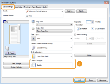 Vyberete-li možnost [Off] (Vypnuto), závisí na nastavení provedeném v aplikaci, zda se výtisky budou, či nebudou třídit.