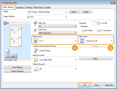 Můžete tisknout více stránek na jeden list. Pomocí možnosti [4 on 1] (4 na 1) nebo [9 on 1] (9 na 1) můžete například vytisknout čtyři nebo devět stránek na jeden list. Tuto funkci použijte, pokud chcete šetřit papírem nebo si dokument prohlédnout ve formě miniatur.