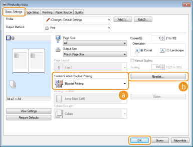 Vyberte možnost [Booklet Printing] (Tisk brožury) v nabídce [1-sided/2-sided/Booklet Printing] (1stranný tisk / oboustranný tisk / tisk brožury)