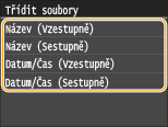 Vyberete-li možnost <Datum/Čas (Vzestupně)> nebo <Datum/Čas (Sestupně)>, soubory se budou řadit podle data a času úpravy souborů.