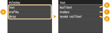 Vyberte objekt, pro který chcete změnit nastavení. <Text> představuje písmena a znaky, <Grafika> představuje čáry a číslice a <Obraz> představuje fotografie a obrázky.