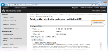 Pár klíčů vygenerovaný žádostí o podepsání certifikátu (CSR) nemůžete použít, dokud nebude certifikát uložen. Jakmile certifikační autorita vystaví digitální certifikát, uložte jej podle následujících pokynů.