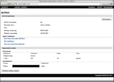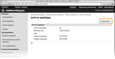 Bejegyezheti a készülék nevét és telepítési helyét, amelyet a készülék azonosítására használhat, valamint más hasonló információkat. A készüléken le is tilthatja az AirPrint funkciót. Ezeket a beállításokat a Távoli felhasználói felületen módosíthatja.