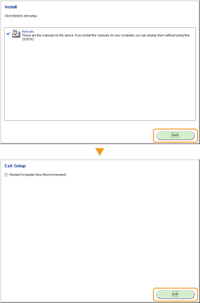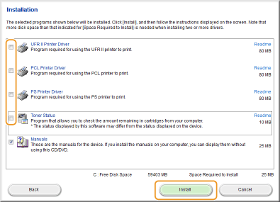 Törölje a jelet minden jelölőnégyzetből a [Manuals] (Kézikönyvek) kivételével, majd kattintson az [Install] (Telepítés) lehetőségre.