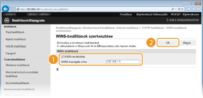 Ha a WINS-kiszolgálónak DHCP-kiszolgáló ad IP-címet, akkor a kapott IP-cím felülbírálja a [WINS-kiszolgáló címe] szövegmezőben megadott IP-címet.