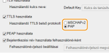 Ez a hitelesítési módszer egy felhasználónévvel és jelszóval hitelesíti az ügyfelet, és egy hitelesítésszolgáltatói tanúsítvánnyal a kiszolgálót. Belső protokollként MSCHAPv2 vagy PAP választható. A TTLS egyszerre használható a PEAP-móddal. Mielőtt ezt a hitelesítési módot beállítaná, engedélyezze a TLS-t a Távoli felhasználói felülethez (