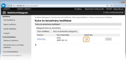 Kattintson a [Kulcs és tanúsítvány beállításai] gombra egy kulcspár ellenőrzéséhez, vagy a [CA tanúsítvány beállításai] gombra egy CA tanúsítvány ellenőrzéséhez.