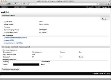 Wyświetlenie okna technologii AirPrint umożliwia dostęp nie tylko do ustawień technologii AirPrint, ale pozwala również na wyświetlenie informacji dotyczących materiałów eksploatacyjnych, takich jak papier i kaseta z tonerem. Co więcej pozwala na konfigurację ustawień funkcji bezpieczeństwa (