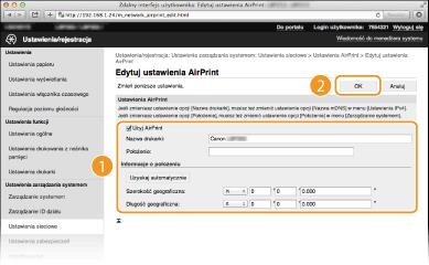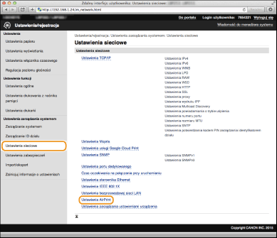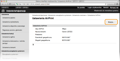 Możliwa jest rejestracja informacji, takich jak nazwa urządzenia oraz lokalizacja instalacji, które posłużą do identyfikacji urządzenia. Można również wyłączyć obsługę technologii AirPrint przez urządzenie. Aby zmienić te ustawienia, należy użyć Zdalnego interfejsu użytkownika.