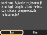 Urządzenie można zarejestrować również z urządzenia przenośnego lub z przeglądarki Google Chrome. Przed zakończeniem rejestracji na wyświetlaczu urządzenia zostanie wyświetlony poniższy ekran z potwierdzeniem. Naciśnij przycisk <Tak>, aby zakończyć rejestrację.