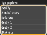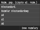 Jeśli pokazany powyżej ekran nie jest wyświetlany podczas ładowania papieruJeśli na tacę wielofunkcyjną ładowany jest zawsze ten sam rozmiar i typ papieru, można pominąć konfigurację ustawień oraz zarejestrować dany rozmiar i typ papieru jako ustawienie domyślne. Po zarejestrowaniu ustawienia domyślnego ekran pokazany powyżej nie jest wyświetlany. Aby go wyświetlić, należy wybrać opcję <Określ podczas ładowania papieru> (Rejestrowanie domyślnych ustawień papieru dla tacy wielofunkcyjnej).