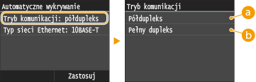 , dotknij <Półdupleks> albo <Pełny dupleks>.![]() <Półdupleks>Naprzemiennie wysyła i pobiera dane komunikacyjne. Opcję tę należy wybrać, gdy urządzenie jest podłączone do urządzenia sieciowego w trybie półdupleks.