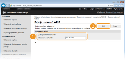 Zaznacz pole wyboru [Rozpoznawanie WINS], skonfiguruj wymagane ustawienia i kliknij przycisk [OK].