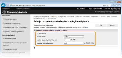 Zaznaczenie tego pola wyboru umożliwia powiadamianie oprogramowania do zarządzania urządzeniami o stanie zasilania urządzenia. Zaznaczenie opcji [Powiadom] pozwala na uniknięcie nawiązywania przez urządzenie zbędnej komunikacji w trybie uśpienia i zmniejszenie całkowitego zużycia energii. [Numer portu]